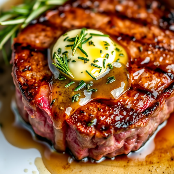 Indulge in a juicy, perfectly seared medium-rare beef steak, seasoned to perfection and paired with a rich garlic herb butter for an unforgettable meal.